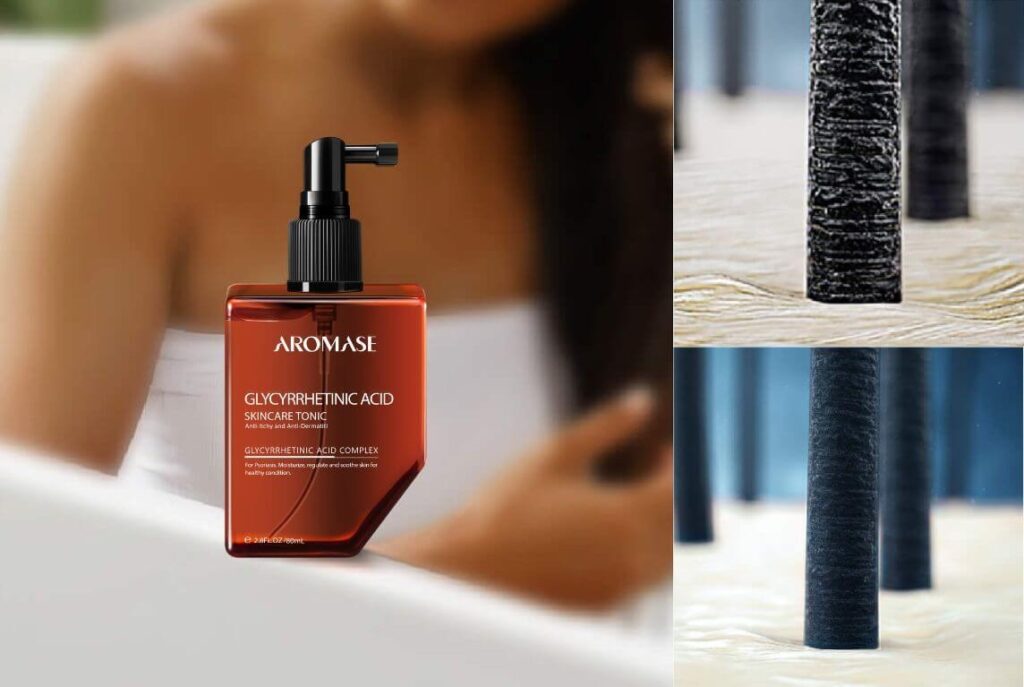 For irritated or sunburned scalps, a soothing scalp tonic containing glycyrrhetinic acid can help calm inflammation and restore balance.